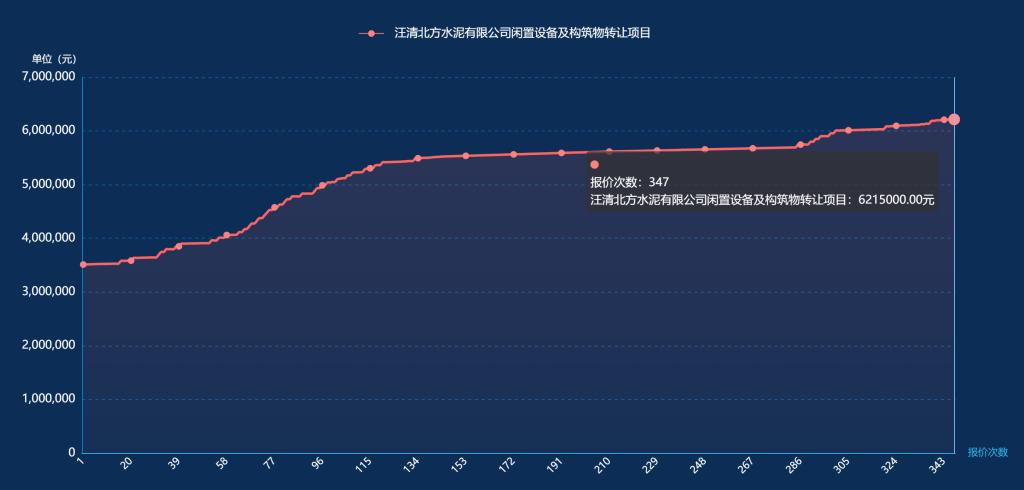2023年9月,中國建材集團(tuán)所屬汪清北方水泥有限公司委托沈交所轉(zhuǎn)讓的閑置設(shè)備及構(gòu)筑物項目完成交割。該項目通過網(wǎng)絡(luò)競價平臺高溢價成交,在信息披露期間沈交所充分 利用平臺優(yōu)勢與宣傳能力共征集到31個意向受讓方,轉(zhuǎn)讓底價為351.2萬元,經(jīng)過347輪次的激烈角逐,最終以621.5萬元成交,增值金額270.3萬元,溢價率76.96%。
