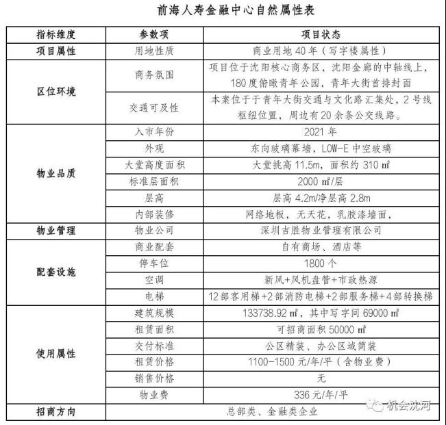 項(xiàng)目簡介:前海人壽金融中心是前海人壽不動產(chǎn)管理平臺進(jìn)駐東北區(qū)域的首個商務(wù)標(biāo)桿作品。項(xiàng)目建筑規(guī)模13萬余平方米,其中寫字間近7萬平方米,目前可招商面積5萬平方米,租賃價格1100-1500元/年/平(含物業(yè)費(fèi))。