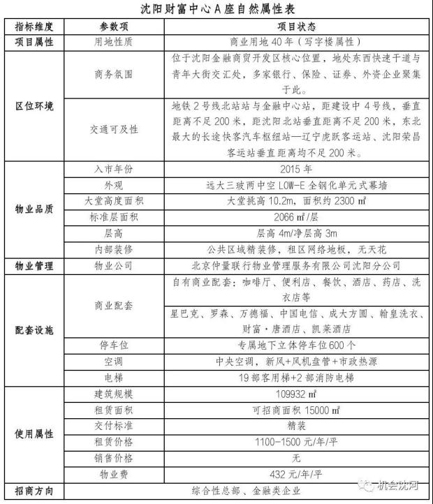 項目簡介:沈陽財富中心A座是集辦公、會議于一體的綜合性國際甲級寫字樓,總建筑面積10萬平方米,地上44層,地下6層,鋼混結(jié)構(gòu)。目前可利用招商空間1.5萬平,租金1100-1500元/年/平。