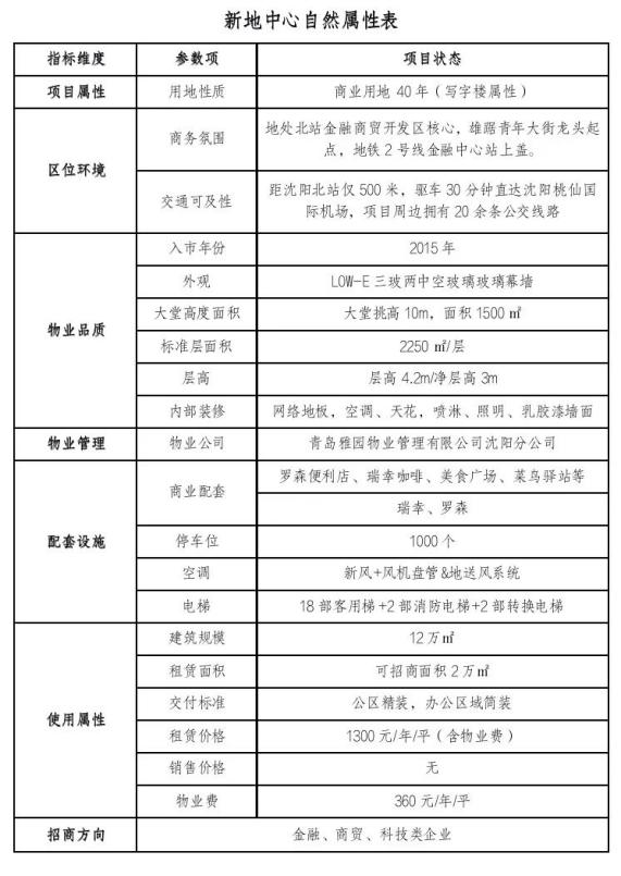 項(xiàng)目簡介:新地中心位于沈河區(qū)友好街10號(hào),2015年年初建成,屬5A甲級(jí)寫字樓,建筑面積12萬平,剩余可招商面積約2.4萬平,地上66層,地下3層,電梯22部,停車位約1000個(gè)。產(chǎn)權(quán)單位為世貿(mào)廣場(沈陽)置業(yè)有限公司,物業(yè)單位為青島雅園物業(yè)管理有限公司沈陽分公司。目前已引進(jìn)奧林巴斯、盛京銀行信用卡中心、凱捷中國、飛利浦、昆侖保險(xiǎn)、阿里巴巴、百事可樂、蒙牛、華泰期貨、中金財(cái)富證券、北京金城同達(dá)律所等120余家知名企業(yè)。