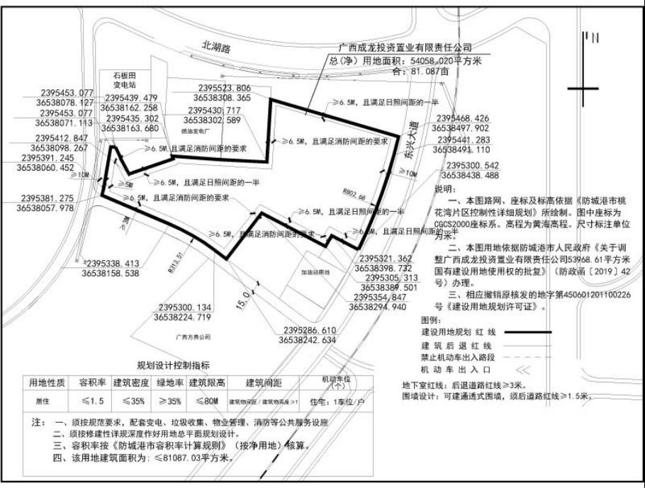 公司現(xiàn)有一處開(kāi)發(fā)用地,位于廣西省防城港市港口區(qū)桃花灣片區(qū)北湖路南側(cè),土地面積54058.02平方米,性質(zhì)為城鎮(zhèn)住宅用地。已取得土地不動(dòng)產(chǎn)權(quán)證、建設(shè)用地規(guī)劃許可證,規(guī)劃條件為:建設(shè)規(guī)?!?1087.03平方米。
