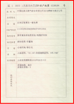 不動產(chǎn)權(quán)證編號為“遼(2022)大連市內(nèi)四區(qū)不動產(chǎn)權(quán)第0228194號”,證載權(quán)利人為“中國石油天然氣股份有限公司東北銷售大連分公司”。建筑面積305.94㎡,土地面積721.2㎡,鋼混結(jié)構(gòu),房產(chǎn)2層,房屋設(shè)計用途為“老干部活動室”,原房產(chǎn)用途為“車庫”。土地用途為“倉儲用地”,土地性質(zhì)為“授權(quán)經(jīng)營”,土地使用期限截止時間為2052年5月13日。
