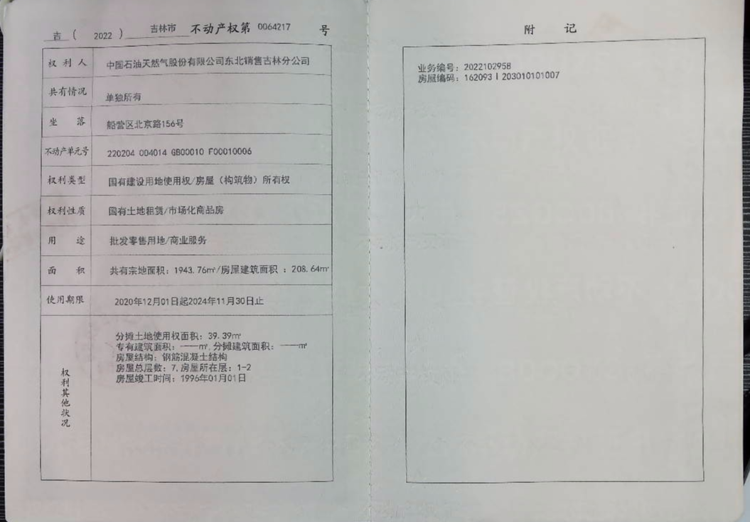 不動產(chǎn)權(quán)證編號為“吉(2022)吉林市不動產(chǎn)權(quán)第0064217號”,證載權(quán)利人為“中國石油天然氣股份有限公司東北銷售吉林分公司”。建筑面積208.64㎡,鋼筋混凝土結(jié)構(gòu),房產(chǎn)所在樓層為1-2層,房屋設(shè)計用途為“商業(yè)服務(wù)”。土地用途為“批發(fā)零售用地”,土地性質(zhì)為“國有土地租賃”,土地使用期限截止時間為2024年11月30日。