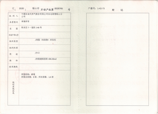 不動產(chǎn)權(quán)證編號為“遼(2020)鞍山市不動產(chǎn)權(quán)第0028746號”,證載權(quán)利人為“中國石油天然氣股份有限公司東北銷售鞍山分公司”。建筑面積496㎡,磚混結(jié)構(gòu),房產(chǎn)共4層,房屋設(shè)計用途為“辦公樓”,后期改裝為“職工宿舍”。土地用途為“其他商服”,土地性質(zhì)為“授權(quán)經(jīng)營”,土地使用期限截止時間為2042年7月2日。