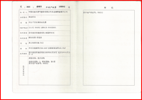 不動產(chǎn)權證編號“遼2022盤錦市不動產(chǎn)權第109942號”,證載權利人為“中國石油天然氣股份有限公司東北銷售盤錦分公司”,建筑面積400㎡,混合結構,共2層,房屋設計用途為“辦公”,原房產(chǎn)用途為“辦公樓”。土地用途為“其他商服用地”,土地性質(zhì)為“授權經(jīng)營”,土地使用期限截止時間為2039年6月29日。