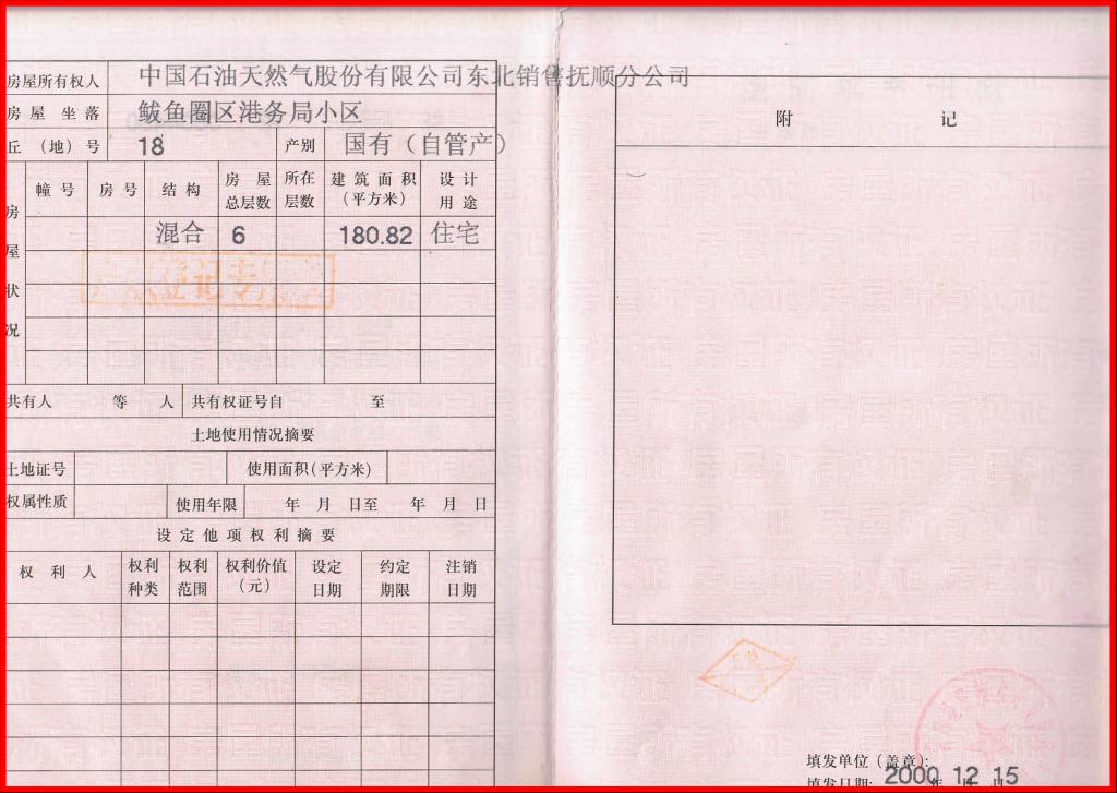(二)住房房權(quán)證編號為鲅房權(quán)證字第0004460號,發(fā)證機(jī)關(guān)為營口市房產(chǎn)管理局。房屋所有權(quán)人為中國石油天然氣股份有限公司東北銷售撫順分公司,建筑面積180.82㎡,產(chǎn)別:國有(自管產(chǎn)),混合結(jié)構(gòu),房屋總層數(shù)為6層,所在樓層302室和501室,房屋設(shè)計(jì)用途為住宅,兩套房產(chǎn)使用一張房照。土地性質(zhì)未知,發(fā)證時(shí)間為2000年12月15日。