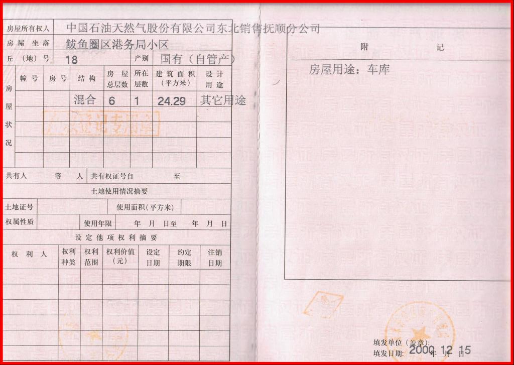 (一)車庫房權(quán)證編號為鲅房權(quán)證字第0004459號,發(fā)證機(jī)關(guān)為營口市房產(chǎn)管理局。房屋所有權(quán)人為中國石油天然氣股份有限公司東北銷售撫順分公司,建筑面積24.29㎡,產(chǎn)別:國有(自管產(chǎn)),混合結(jié)構(gòu),房產(chǎn)所在樓層為1/6層,房屋設(shè)計(jì)用途為其他用途。房屋用途為車庫,土地性質(zhì)未知,發(fā)證時(shí)間為2000年12月15日。