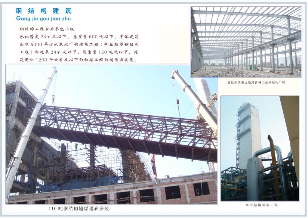 主營業(yè)務(wù):工業(yè)民用建筑,礦業(yè)工程、市政工程、冶金工程、金屬結(jié)構(gòu)制作安裝,機電設(shè)備安裝,機械加工、裝飾裝修工程、防腐保溫工程、地基基礎(chǔ)工程,兼營鋼材銷售;道路普通貨物運輸;建筑機械設(shè)備租賃;園林綠化工程;管道和設(shè)備安裝,建筑物拆除工程。經(jīng)營證照齊全,年檢合格。