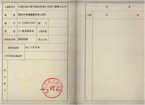 房產(chǎn)證編號“簡房權(quán)證監(jiān)證字第0029159號”,證載權(quán)利人為“中國石油天然氣股份有限公司四川簡陽銷售分公司”,建筑面積3719.33㎡,混合結(jié)構(gòu),共8層,房屋設(shè)計(jì)用途為“辦公”,原房產(chǎn)用途為“賓館”。土地證編號“川國用(2000)字第00400號”,證載權(quán)利人為“中國石油天然氣股份有限公司四川銷售分公司”,土地用途為“11-商業(yè)服務(wù)業(yè)”,土地性質(zhì)為“授權(quán)經(jīng)營”,土地面積521.71㎡。