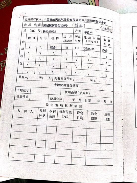 房產(chǎn)位于簡陽市簡城鎮(zhèn)新民街108號,上世紀(jì)九十年代末建成,房產(chǎn)實(shí)際持有人為“中國石油天然氣股份有限公司四川成都銷售分公司”。