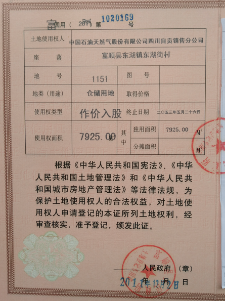 土地證編號(hào)“富國(guó)用(2011)第1020169號(hào)”,證載權(quán)利人為“中國(guó)石油天然氣股份有限公司四川自貢銷售分公司”,土地用途為“倉(cāng)儲(chǔ)用地”,土地性質(zhì)為“作價(jià)入股”,土地面積7925㎡,無(wú)使用截止時(shí)間。