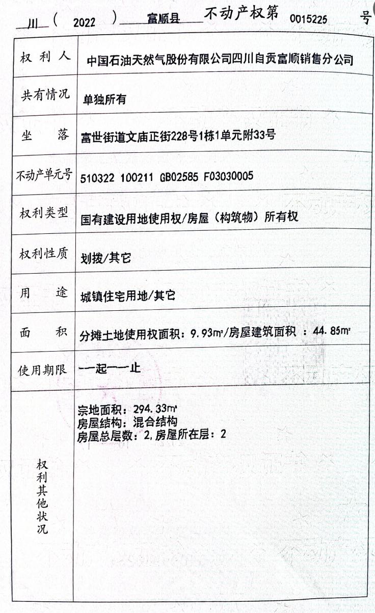 不動產(chǎn)權(quán)證編號為“川(2022)富順縣不動產(chǎn)權(quán)第0015225號”,證載權(quán)利人為“中國石油天然氣股份有限公司四川自貢富順銷售分公司”,建筑面積為44.85㎡,混合結(jié)構(gòu),層數(shù)為2層,原房產(chǎn)用途為“宿舍”,土地用途為“城鎮(zhèn)住宅用地”,土地性質(zhì)為“劃撥”,土地面積9.93㎡,無使用截止時間。