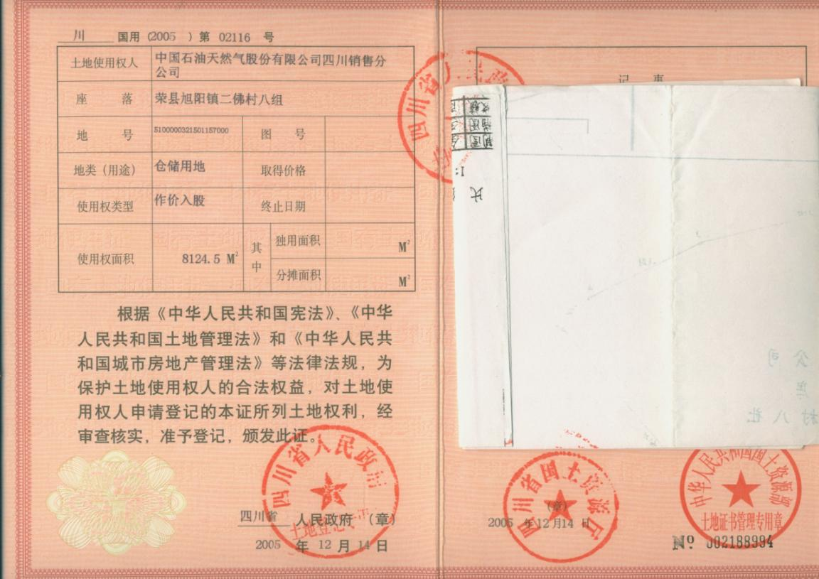 土地證編號“川國用(2005)第02116號”,證載權(quán)利人為“中國石油天然氣股份有限公司四川銷售分公司”,土地用途為“倉儲用地”,土地性質(zhì)為“作價入股”,土地面積8124.5㎡,無使用截止時間。