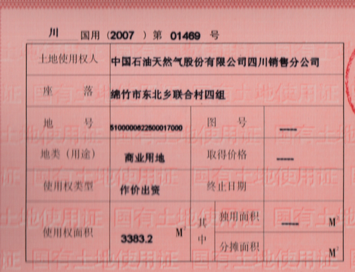 土地證編號(hào)“川國(guó)用(2007)第01469號(hào)”,證載權(quán)利人為“中國(guó)石油天然氣股份有限公司四川銷售分公司”,土地用途為“商業(yè)用地”,土地性質(zhì)為“作價(jià)出資”,土地面積3383.2㎡,土地?zé)o限制使用期限。