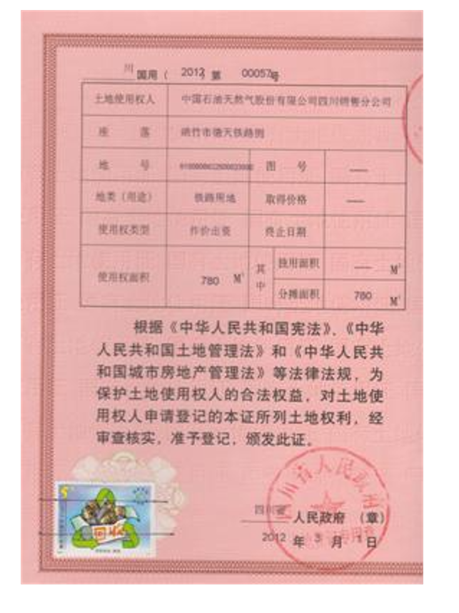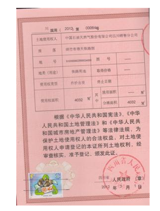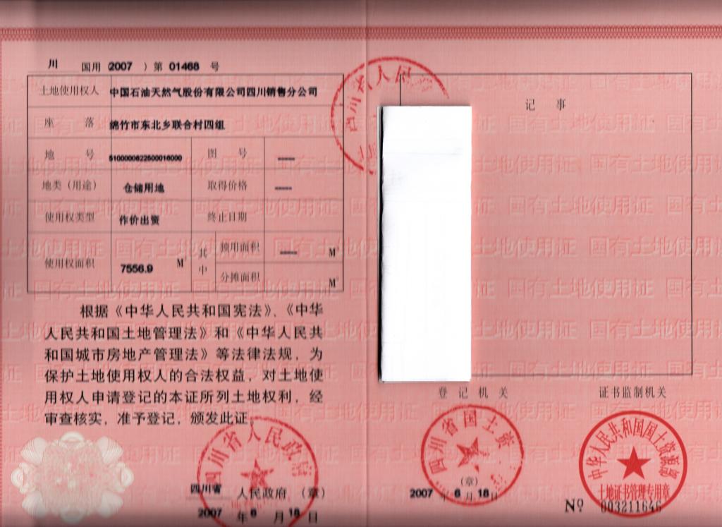 土地證編號(hào)“川國(guó)用(2007)第01467號(hào)/川國(guó)用(2012)第00057號(hào)/川國(guó)用(2012)第00064號(hào)/川國(guó)用(2007)第01468號(hào)”,證載權(quán)利人為“四川省石油集團(tuán)德陽(yáng)有限公司綿竹分公司”,土地用途為“倉(cāng)儲(chǔ)用地/鐵路用地/鐵路用地/倉(cāng)儲(chǔ)用地”,土地性質(zhì)為“作價(jià)出資”,土地面積779/780/4032/7556.9㎡,土地?zé)o限制使用期限。