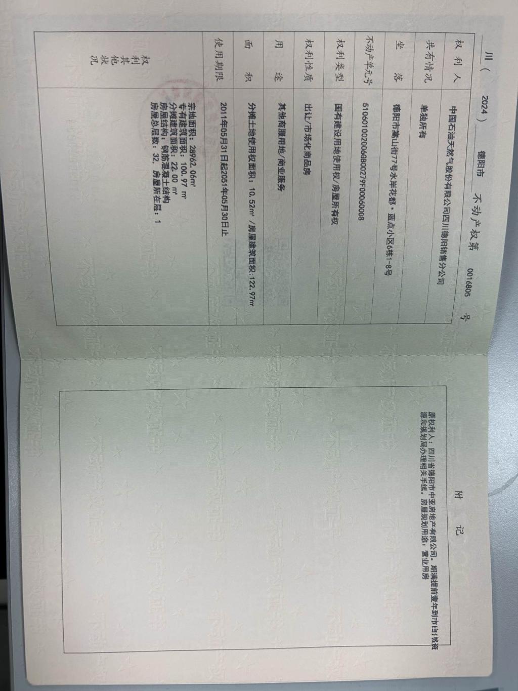 不動產權證編號“川(2024)德陽市不動產權第0016805號”,證載權利人為“中國石油天然氣股份有限公司四川德陽銷售分公司”,房產面積122.97㎡,房屋設計用途為“商業(yè)服務”。土地用途為“其他商服用地”,土地性質為“出讓”,土地面積10.52㎡,土地使用期限截止時間為2051年5月30日。