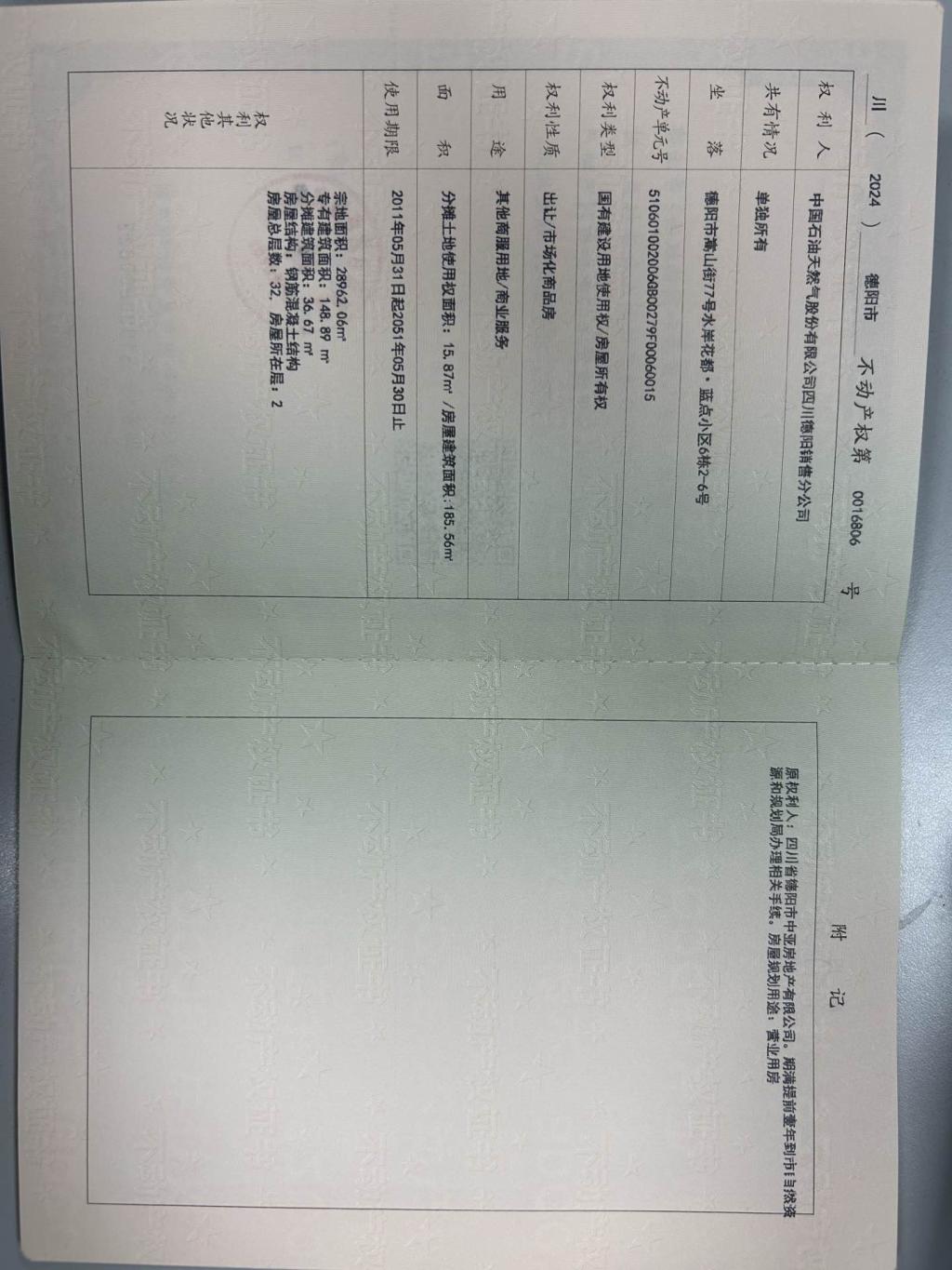 不動(dòng)產(chǎn)權(quán)證編號(hào)“川(2024)德陽(yáng)市不動(dòng)產(chǎn)權(quán)第0016806號(hào)”,證載權(quán)利人為“中國(guó)石油天然氣股份有限公司四川德陽(yáng)銷售分公司”,房產(chǎn)面積185.56㎡,房屋設(shè)計(jì)用途為“商業(yè)服務(wù)”。土地用途為“其他商服用地”,土地性質(zhì)為“出讓”,土地面積15.87㎡,土地使用期限截止時(shí)間為2051年5月30日。