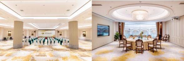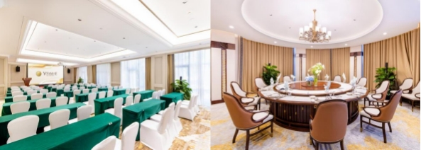 餐飲區(qū)域面積 2241 平米,包含餐飲咖啡廳 1 個,普通包間義坊、信廳、禮閣、智堂4 個廳,豪華泰山包間 1 個。會議廳包含貴賓接待室 1 個,湖景會議廳 1 個,鬧吧多功能廳 1 個(B1 宴會廳)。