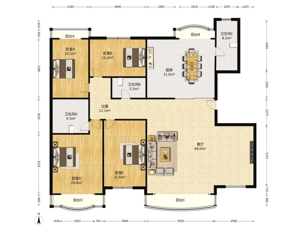 此房屋位于第1層,建筑面積258.37平方米,南北朝向,不把山,不臨街。格局為四室兩廳三衛(wèi)一廚,兩南臥室,兩北臥室,主臥室及對應(yīng)北臥室有陽臺,客廳與餐廳有陽臺,室內(nèi)毛坯無裝修,樓前為小區(qū)綠化園林。
