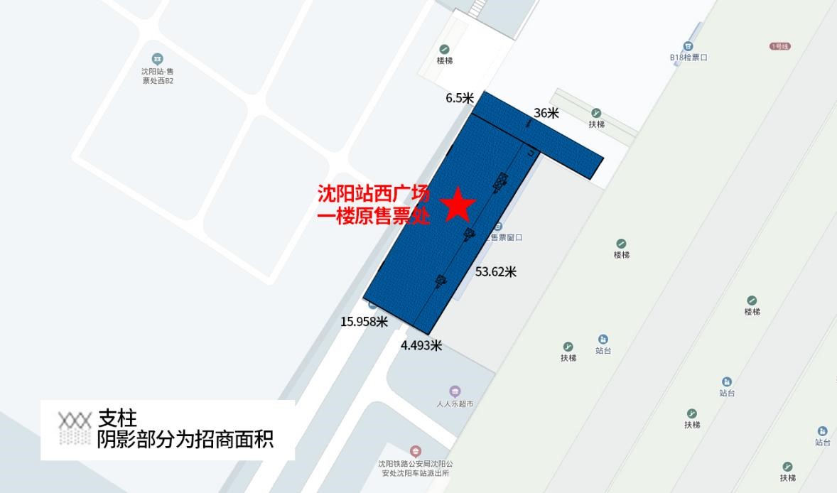 沈陽站西廣場(chǎng)一樓原售票處位于和平區(qū)勝利南街2號(hào),面積約為1314.58平方米,其中大廳部分長(zhǎng)為53.62米,寬20.45米,內(nèi)有立柱三個(gè)面積為16平方米,西廣場(chǎng)進(jìn)站大廳右側(cè)長(zhǎng)36米,寬6.5米。西側(cè)有三對(duì)玻璃推門,北側(cè)一個(gè)門。(見平面圖)