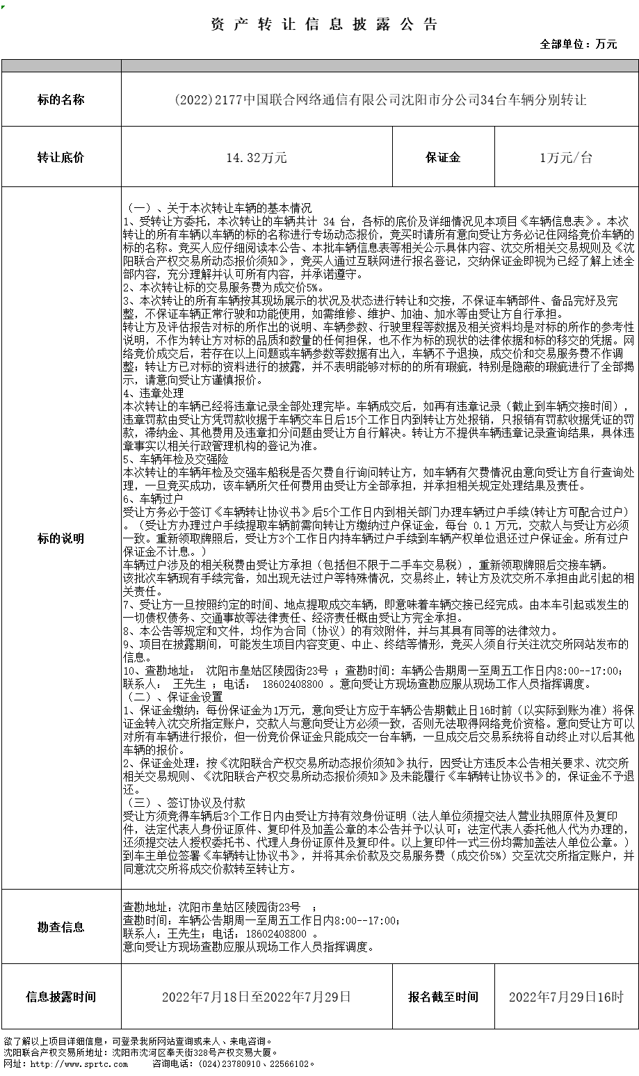 項目鏈接:(2022)2177中國聯(lián)合網(wǎng)絡(luò)通信有限公司沈陽市分公司34臺車輛分別轉(zhuǎn)讓專場項目