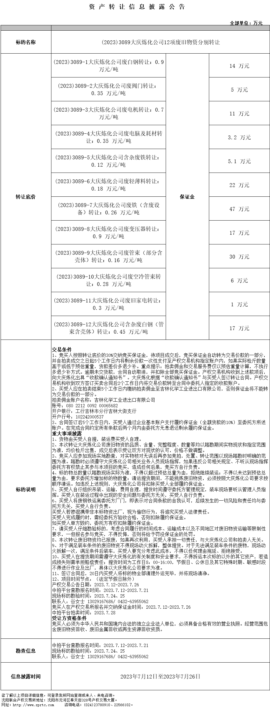 (2023)3089大慶煉化公司12項廢舊物資分別轉(zhuǎn)讓