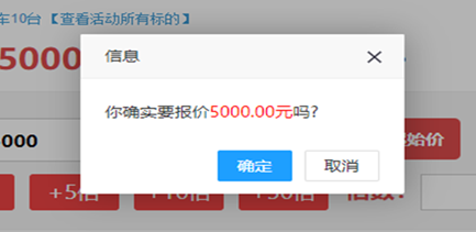 點擊應起始價,系統(tǒng)彈出提示信息(如上圖),核對后點擊確定,報價成功。如果已經(jīng)有人報價,點擊報價即可。
