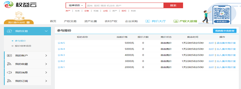 如打算對多個標的進行報價,可點擊項目后側(cè)加入集中競價室將項目加入集中競價室,點擊進入我的集中競價室(如下圖),所選項目會出現(xiàn)在集中競價室頁面。