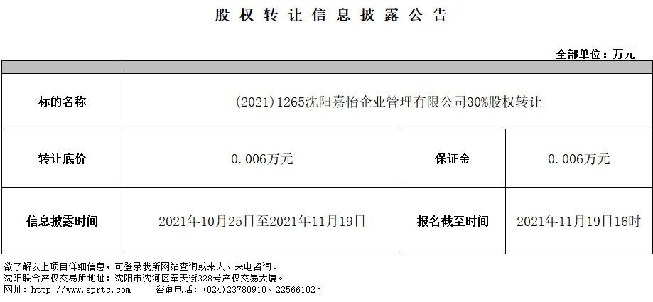 沈陽嘉怡企業(yè)管理有限公司30%股權(quán)轉(zhuǎn)讓