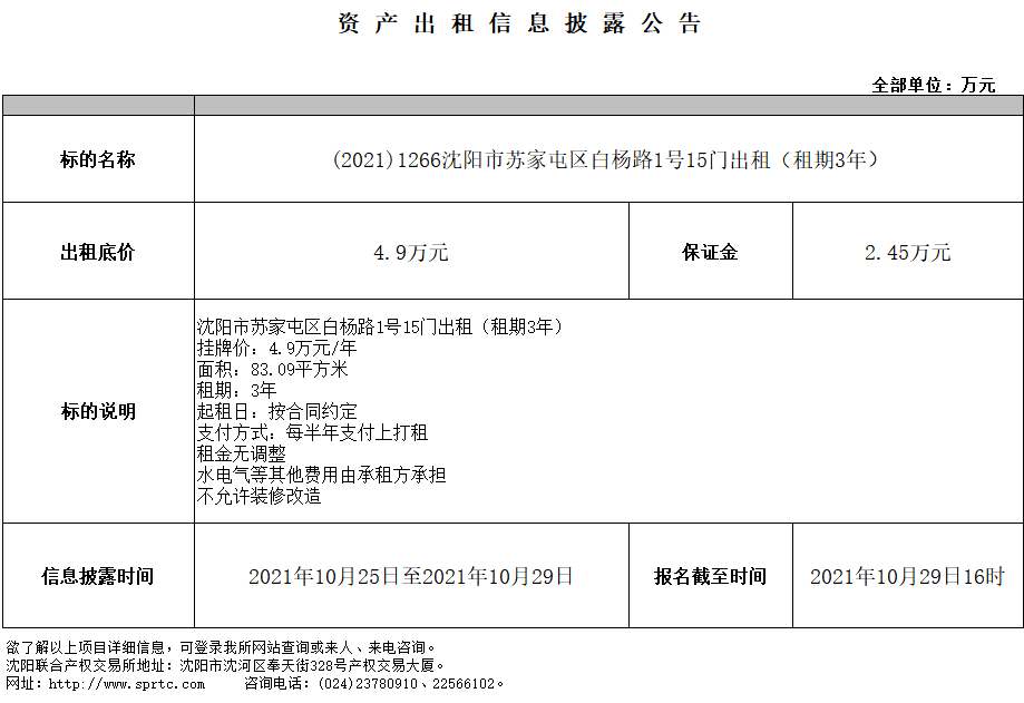 沈陽市蘇家屯區(qū)白楊路1號15門出租(租期3年)