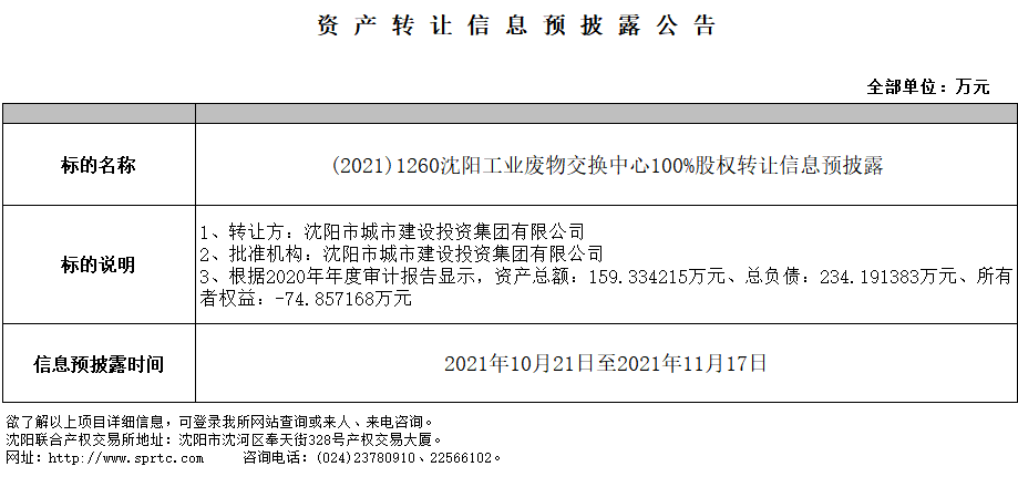沈陽(yáng)工業(yè)廢物交換中心100%股權(quán)轉(zhuǎn)讓信息預(yù)披露