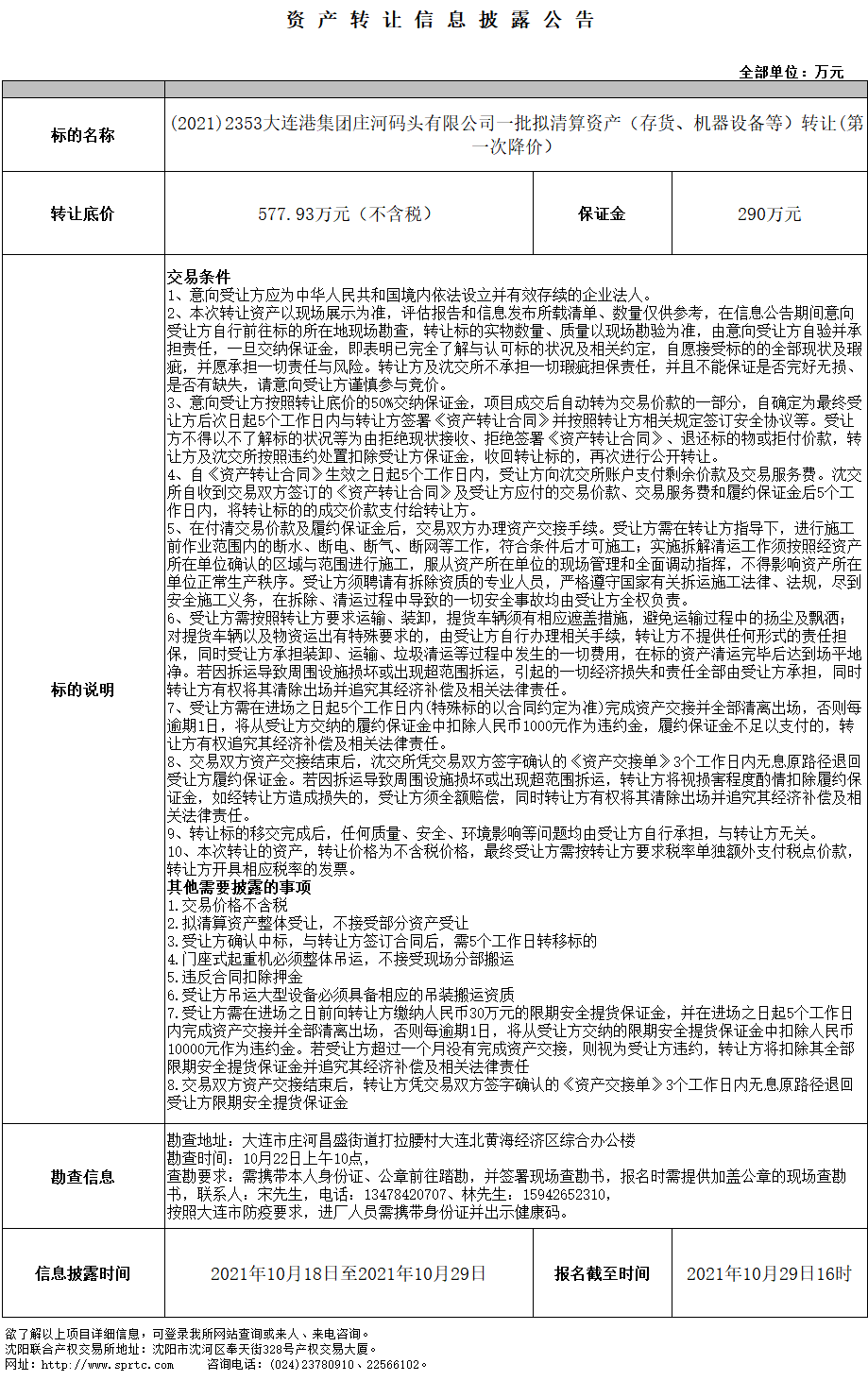 大連港集團(tuán)莊河碼頭有限公司一批擬清算資產(chǎn)(存貨、機(jī)器設(shè)備等)轉(zhuǎn)讓 (第一次降價(jià))
