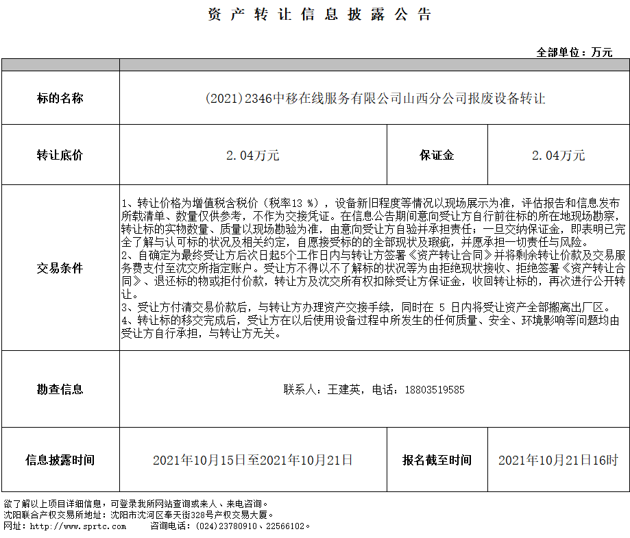中移在線服務有限公司山西分公司1448臺(套)報廢設備轉(zhuǎn)讓