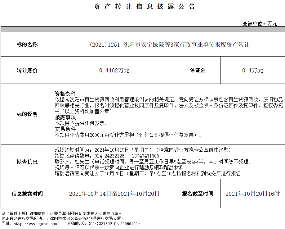 沈陽(yáng)市安寧醫(yī)院等3家行政事業(yè)單位報(bào)廢資產(chǎn)轉(zhuǎn)讓