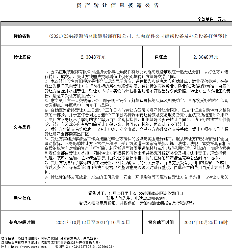 凌源鴻益服裝服飾有限公司、油泵配件公司縫紉設(shè)備及辦公設(shè)備打包轉(zhuǎn)讓