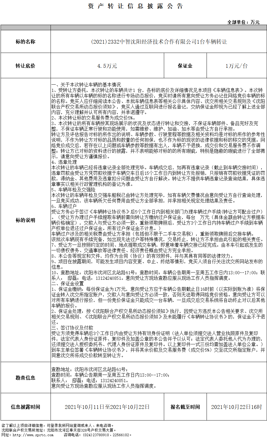 中智沈陽經(jīng)濟技術(shù)合作有限公司1臺 車輛轉(zhuǎn)讓