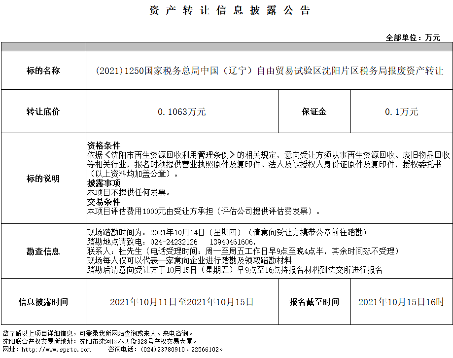 國家稅務(wù)總局中國(遼寧)自由貿(mào)易試驗(yàn)區(qū)沈陽片區(qū)稅務(wù)局報(bào)廢資產(chǎn)轉(zhuǎn)讓