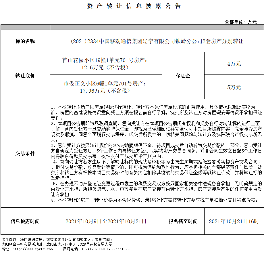 01、中國(guó)移動(dòng)通信集團(tuán)遼寧有限公司鐵嶺分公司轉(zhuǎn)讓首山花園小區(qū)19幢1單元701號(hào)房產(chǎn)