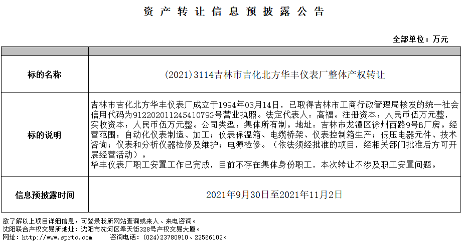 吉林市吉化北方華豐儀表廠整體產(chǎn)權轉(zhuǎn)讓