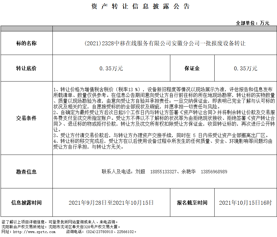 中移在線服務(wù)有限公司安徽分公司一批報(bào)廢設(shè)備轉(zhuǎn)讓