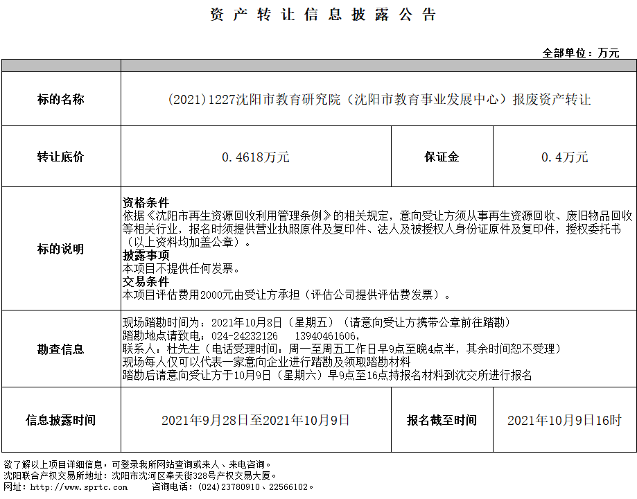沈陽市教育研究院(沈陽市教育事業(yè)發(fā)展中心)報(bào)廢資產(chǎn)轉(zhuǎn)讓