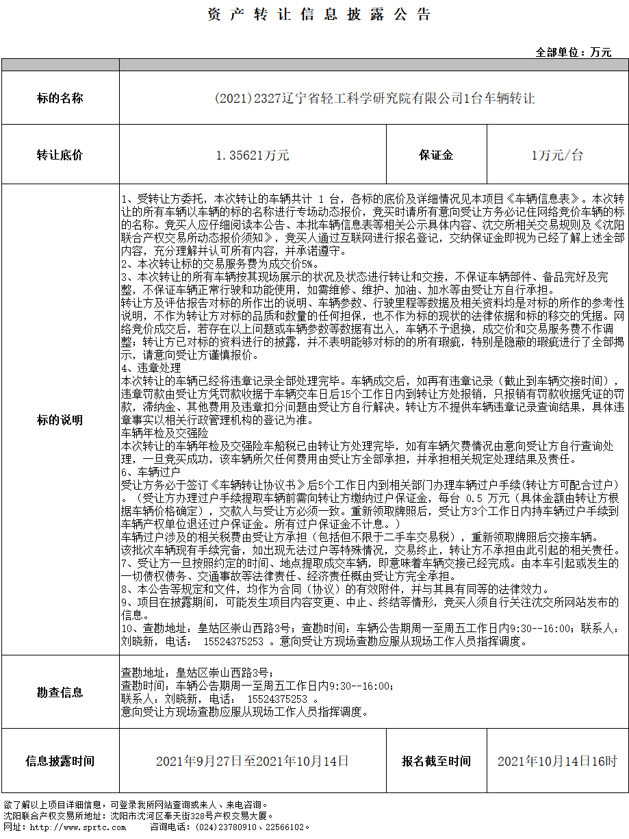 遼寧省輕工科學(xué)研究院有限公司1臺(tái)車(chē)輛轉(zhuǎn)讓