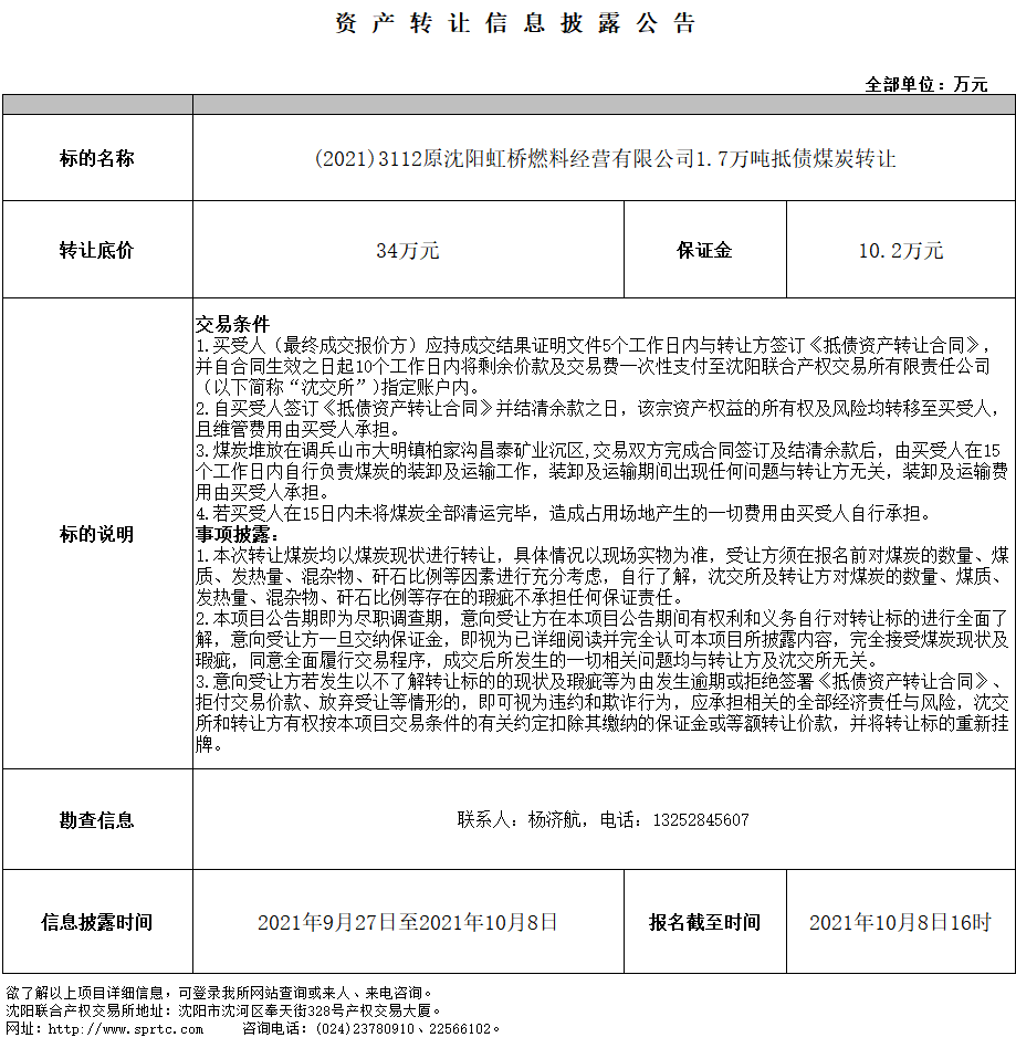 (2021)3112原沈陽虹橋燃料經(jīng)營有限公司1.7萬噸抵債煤炭轉(zhuǎn)讓