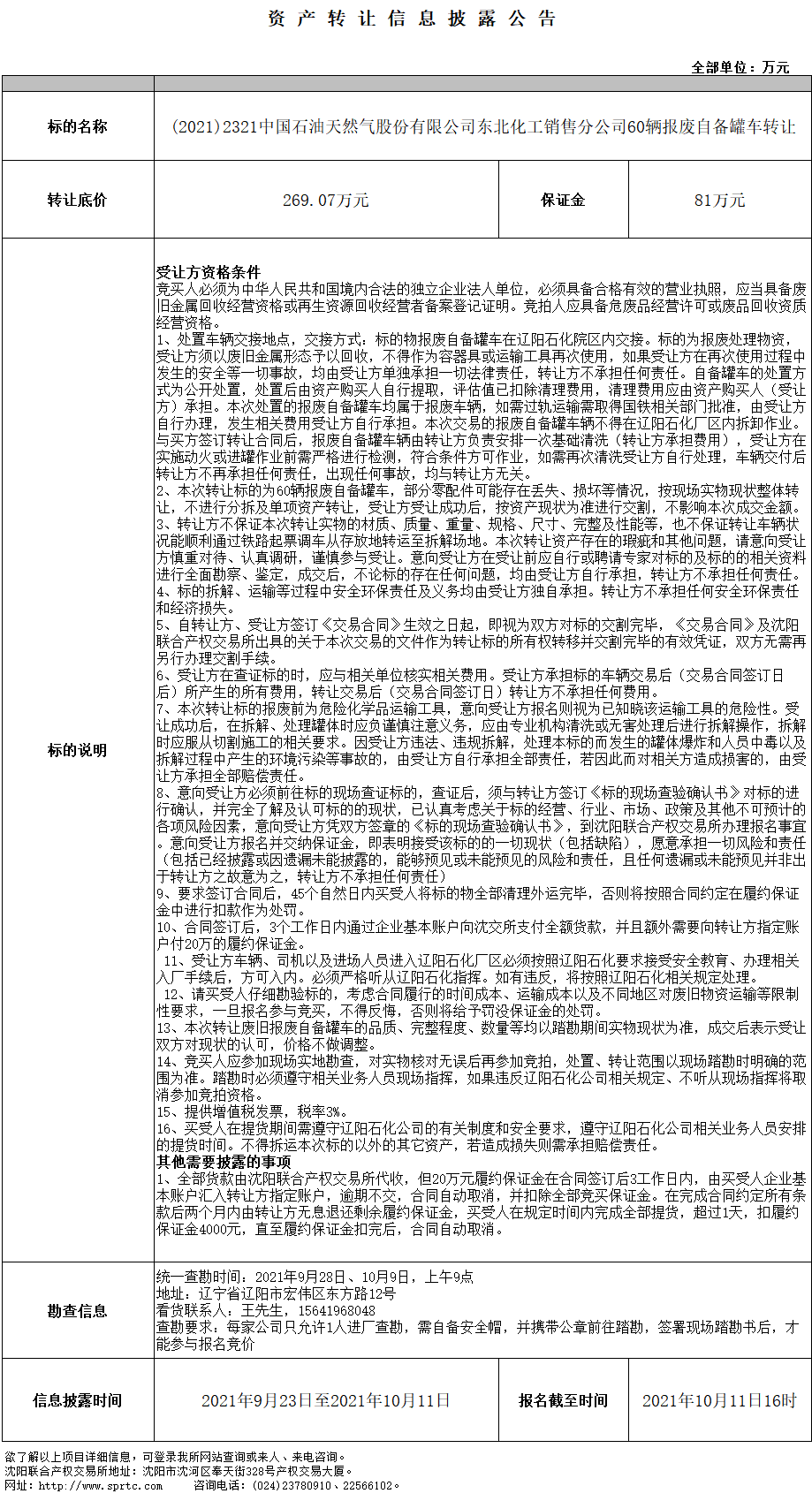 中國(guó)石油天然氣股份有限公司東北化工銷售分公司60輛報(bào)廢自備罐車轉(zhuǎn)讓