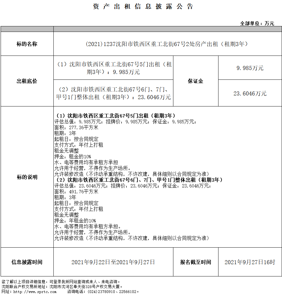 沈陽(yáng)市鐵西區(qū)重工北街67號(hào)6門、7門、甲號(hào)1門整體出租(租期3年)