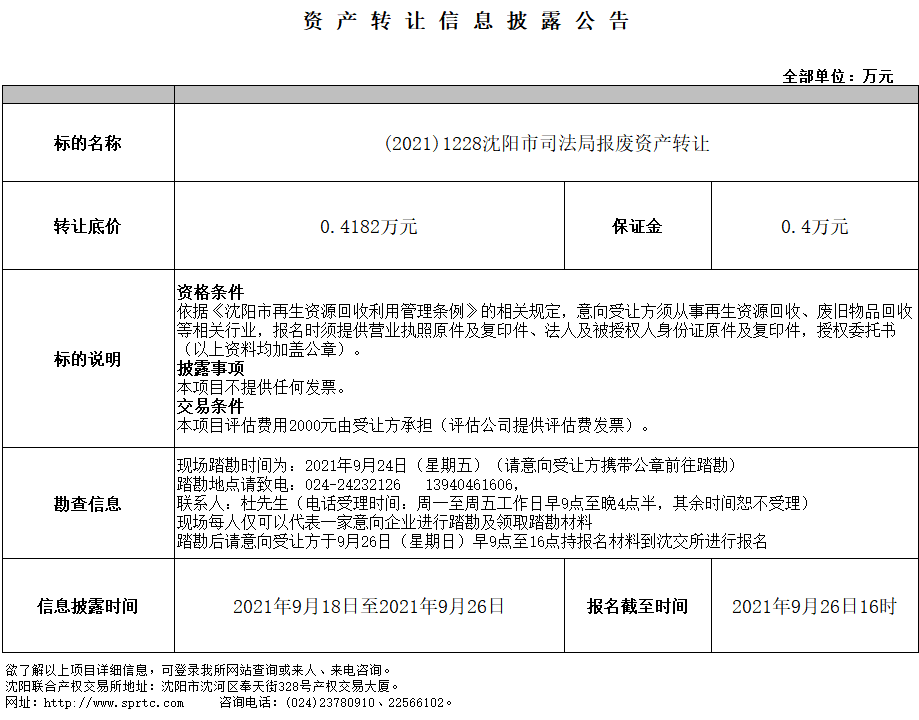 沈陽市司法局報廢資產(chǎn)轉(zhuǎn)讓