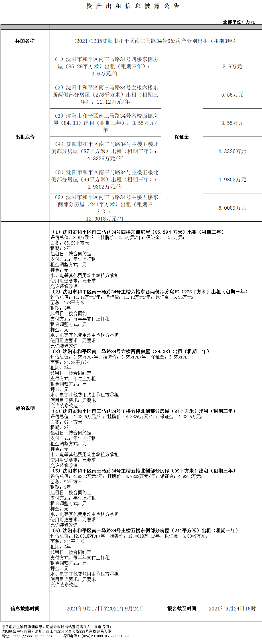 沈陽市和平區(qū)南三馬路34號主樓六樓東西兩側(cè)部分房屋(278平方米)出租(租期三年)
