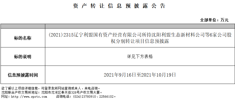 沈陽利盟生態(tài)新材料有限公司60%股權(quán)轉(zhuǎn)讓預(yù)披露