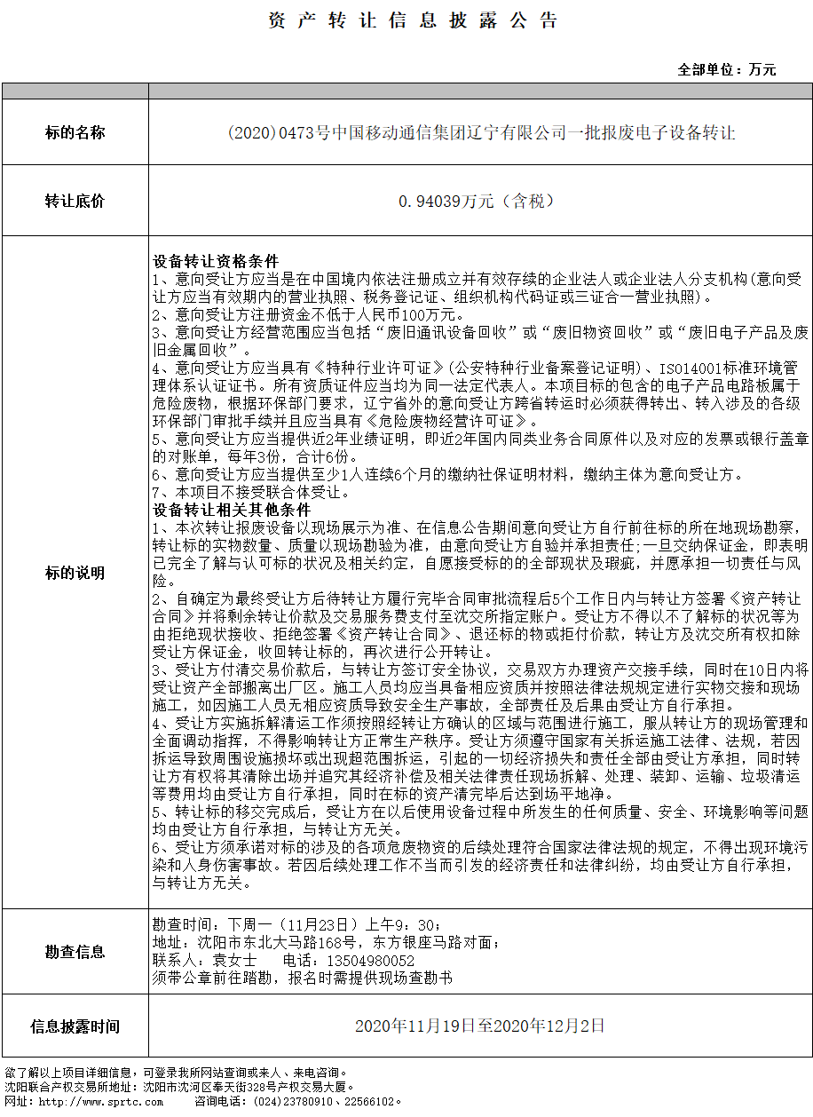 中國移動通信集團(tuán)遼寧有限公司一批報廢電子設(shè)備轉(zhuǎn)讓