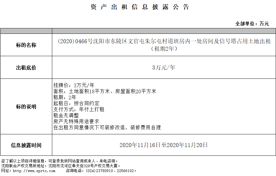 沈陽(yáng)市東陵區(qū)文官屯朱爾屯村道班房?jī)?nèi)一處房間及信號(hào)塔占用土地出租(租期2年)